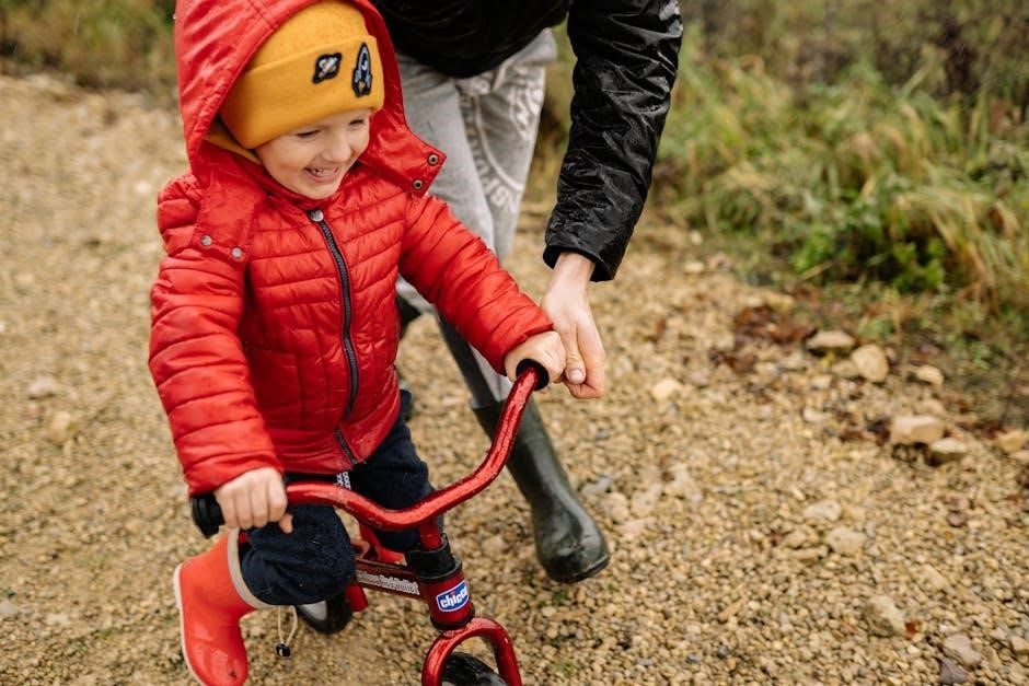 Children’s bike frame sizes are typically determined by wheel size rather than frame dimensions, with options ranging from 12 inches to 24 inches. A 12-inch bike is suitable for younger kids (2-4 years), while a 16-inch bike fits children aged 4-6 years; Older kids (6-8 years) often ride 20-inch bikes, and 24-inch bikes are for preteens (8-12 years). Standover height is crucial; the child should have 1-2 inches of clearance when standing flatfooted. Sizing also considers the child’s inseam and reach. Some bikes offer adjustable features to grow with the child. Always ensure the bike is lightweight and easy to handle, as this improves safety and confidence. Test rides are recommended to confirm the best fit, ensuring comfort and proper posture for young riders. This approach helps in selecting a bike that supports their growth and riding development. Proper sizing enhances both safety and enjoyment for children.